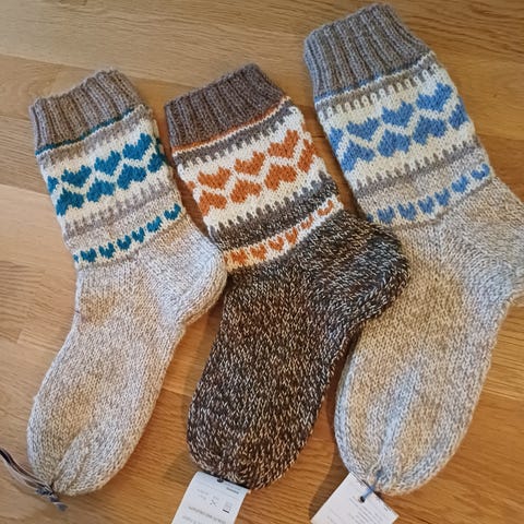 Kjempefine ullsokker i et fint garn som ikke er så veldig tykt. Gjesdal rebell 75% ull 25% nylon (forsterkning) garnet er melert og derfor så fint mønster. Passer godt som en sommersokk da det er et mykt og lett garn. Passer såvel i en støvel eller bare til kos.