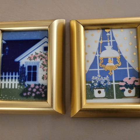 Bildene måler 12 x 15 cm, inkl. gullrammene.