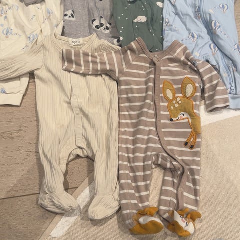 Helt nye klær med lappen på. Får ikke byttet pga lappen er klippet eller hadde jeg bare byttet til en mindre størrelse. Selges derfor helt ubrukt med lappen på. 4 korte pysjamas/sommerdrakter, en fin tynn sommerbukse og en T-skjorte, alt i str 74
