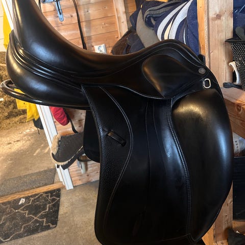 Kent & masters s-series surface dressursal 17 1/2’’ med utskiftbar bom. W bom står i nå. Selges da jeg ikke bruker den lenger etter å ha mistet hest. Den er i god stand, kjøpt ny for 3 år siden ca. Godt vedlikeholdt. Noe redusert pris pga et felt i sete der overflaten er pusset bort (se bilde). Ikke betydelig for bruk, og ikke blitt større etter vi stoppet å pusse akkurat på dette området.