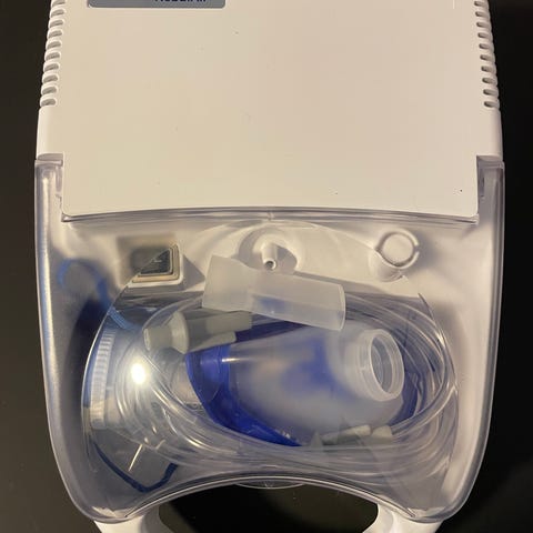 Det følger med munnstykke med ventil, 1 stk maske til voksne, 1 stk maske til barn, 1 stk beholder til skylling av øvre luftveier og en lufteslange.
