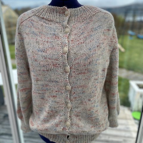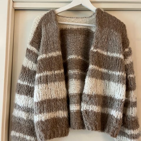 Jakke strikket i garn fra Camilla Phil. Myk og god, med lommer foran. Jakka er i str S. Den kan brukes både åpen og lukket, f.eks. over kjoler på sommerkvelder!