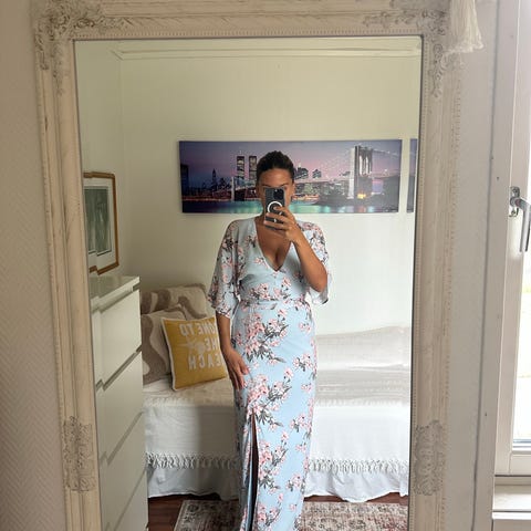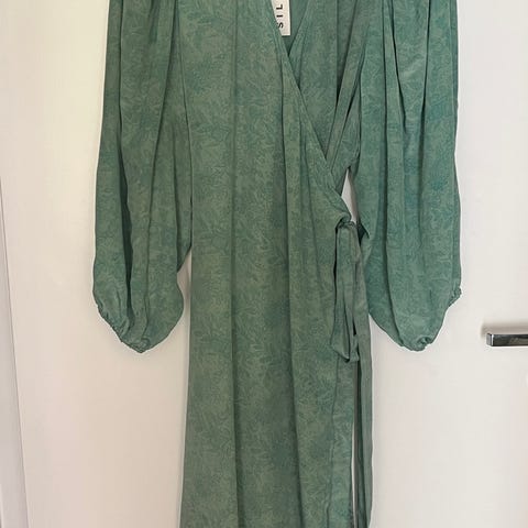Lang kimono kjole i lett, fin silke. Kun brukt en gang. Jeg er en str 38/40 og sitter fint.
