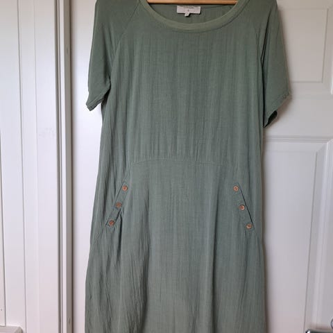 Tettsittende kjole fra Ichi str XL (noe liten i str så mer enn L), delikat rynket i ene siden og stopper midt på leggen på meg som er 160 cm. Mykt bomullsstoff.