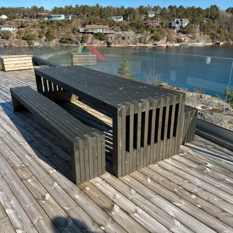 Bygger også benker, samme som bordet. Disse har plass under bordet.
