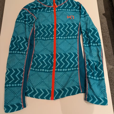 Superfin, nesten ubrukt fleece jakke. Turkise farger mønsteret. Glidelås lukking Har lagt i skapet en stund.