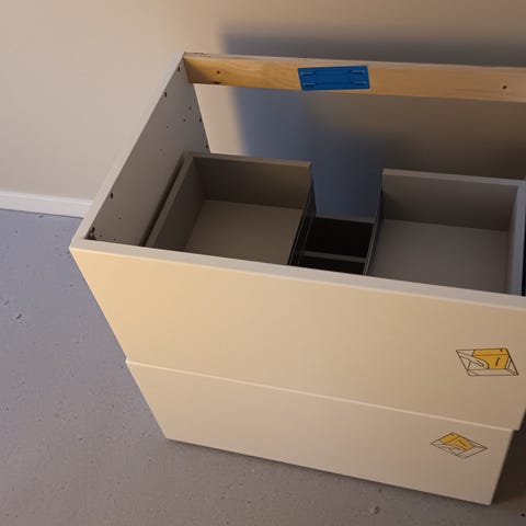 Er 2 hull på innside av skuffen. Kommer fra håndtak som var montert på innsiden. Håndtak er ikke inkludert.