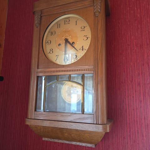 Velholdt Junghans pendelur fra 1962, i massiv eik og med klassisk tysk mekanisk urverk. Klokken går pent og holder tiden godt. Timeslag fungerer som den skal.