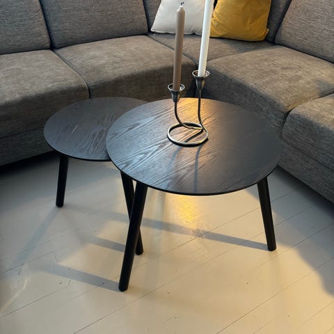 Rundt kaffebord / avlastningsbord med halvglans / matt svart finish. Tre ben i metall, ingen bruksmerker på oversiden og siden. Trestruktur på overflaten