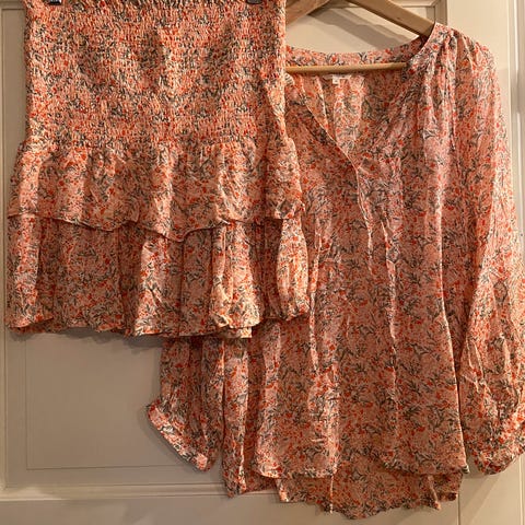 Flott sett fra Part Two, str 36. Toppen er oversized, tynn, småblomstrete. Skjørtet er stor for størrelsen, det er i lin, ensfarget rosa. Kr 500 for begge to