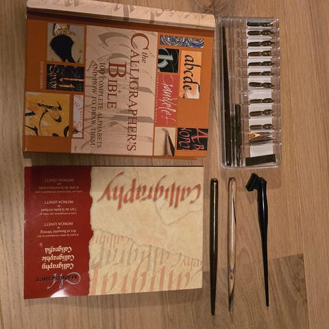 1) Kalligrafisett i eske- ubrukt men esken noe falmet i fargen.