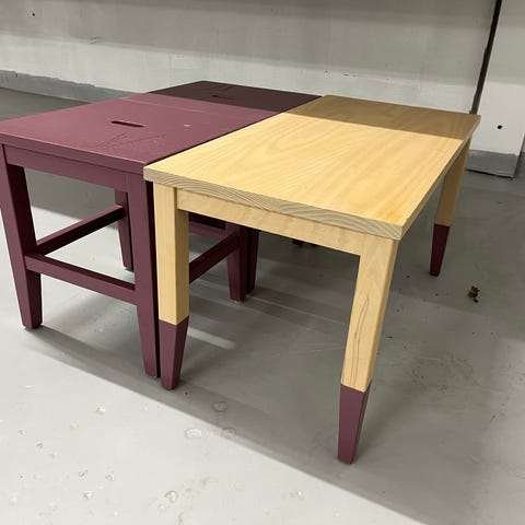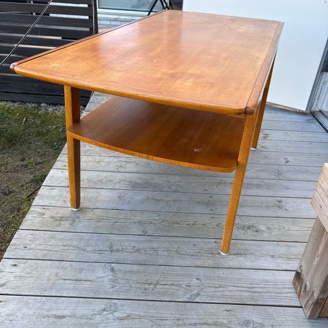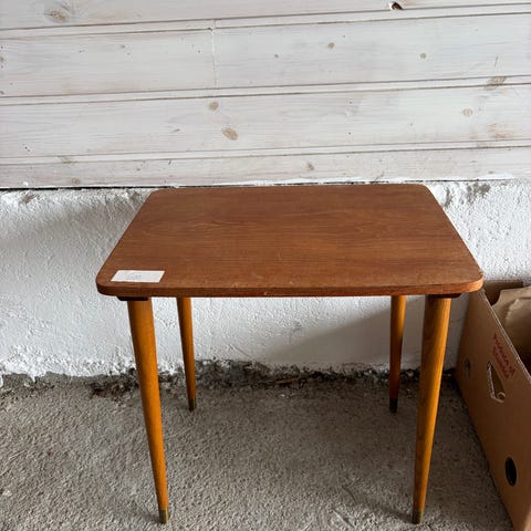 Selger disse stilige tre settebordene, eller såkalte nesting tables, fra 60-tallet eller deromkring. De er laget av teak og har spor for å kunne settes inn i hverandre, men fordi de er malt flere ganger, glir de ikke helt inn. Kanskje noen ønsker å slipe, pusse ned og restaurere dem? De to rosa er i ganske grei stand med færre merker på overflaten, mens det lilla har ganske mye merker og flekker, samtidig som beina løsner litt (se siste bilde). Så det må nok limes. Uansett er dette unike bord, og de er solid laget med pent avrundede kanter.