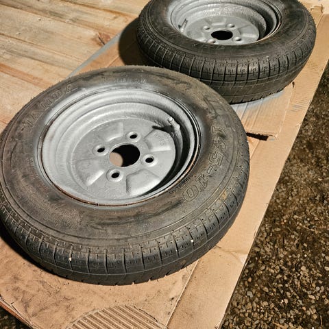 4x100 boltsirkel. Stått på Gaupen boggihenger. Utslitte dekk