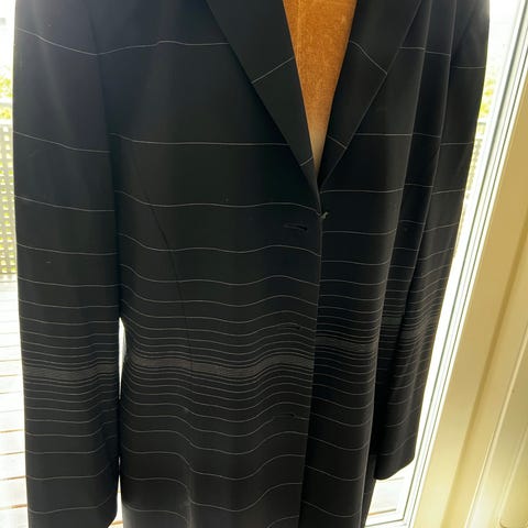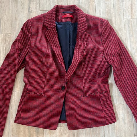 Denne pent brukte blazeren i veldig good stand, fra det anerkjente luksusmerket Escada. Jakken er produsert i en blanding av 98% ull og 2% elastan, og presenteres i en moteriktig "yellow butter"-farge.
