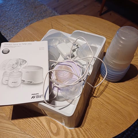 Selger Philips Avent brystpumpe. Flasker og bokser til oppbevaring følger med. Pumpen er kjøpt i 2019, men kun brukt en gang og har ligget på loftet siden. Må hentes!