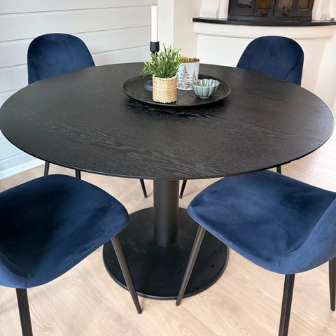 Pent brukt spisestue tilsalgs, dog slitasje i skinn på barstoler, og en ripe på hver av ileggsplatene.