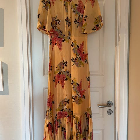 Sommerkjole med blomsterprint. Størrelse XS, men passer også til S, kanskje også M. Strikk i midjen fremhever midjen på en fin måte.