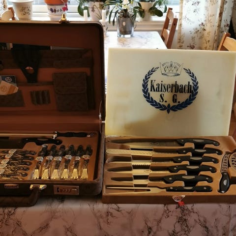 Knivene er ubrukte og kommer med plastikk rundt seg, men kofferten er litt slitt og har noen merker. Men, kofferten er bare evt oppbevaring for det er knivene som gjelder!