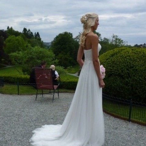 Nydelig kjole! Behagelig . Brukt en gang. Kjøpt på Belle Amie brudesalong i Bergen for 14 900 i 2019. Sløret kan følge med. Renset og klar for ny brud 💜
