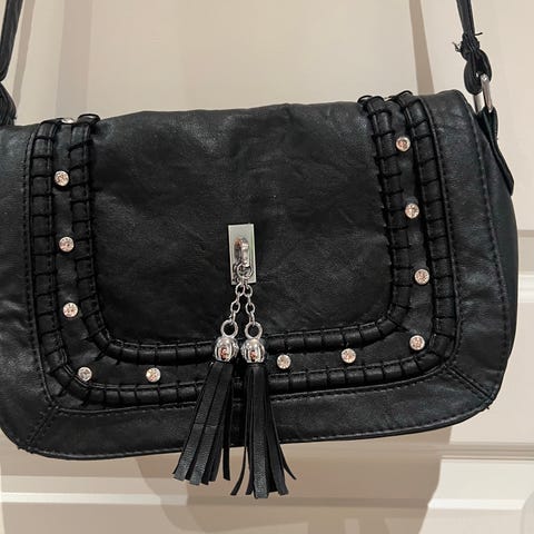 Den har ett rom med plass til kort/lommebok, leppestift/lebepomade, og en liten mobiltelefon.