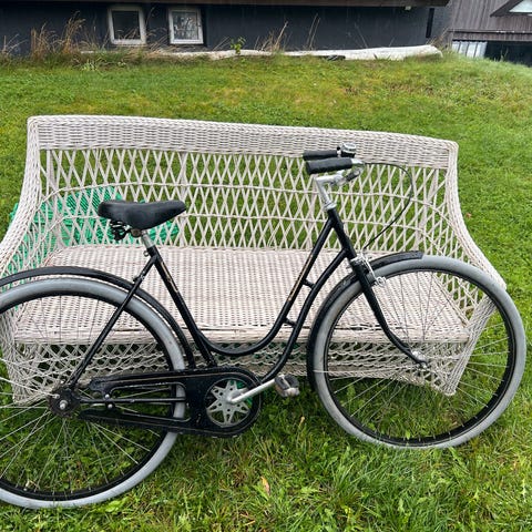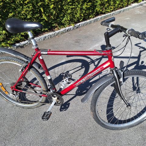 Herresykkel 21 gir. Det eneste som er gjort siden ny er nye dekk. Sykkelen er veldig bra, men jeg har ikke brukt den på flere år. Det minste drevet på bakhjulet, som er mutteren til drevsatsen er sprukket, men det er justert bort fra giringen, så det er fortsatt 18 brukbare gir igjen.