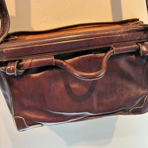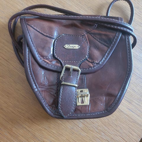 Selger en flott vintage -80 talls veske. Den har ligget ubrukt her i mange år. Er fin innvendig men se bilde av en liten skade i læret utvendig., se bilder med tekst.