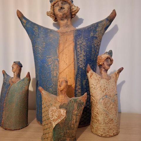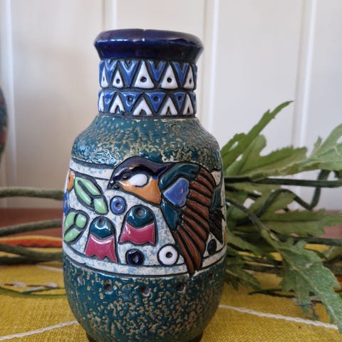 Amforaen er laget i keramisk materiale og malt i svart, gull og terrakotta-farger. Den har noe slitasje i malingen (se bilder), som gir den et autentisk og rustikt preg. Egner seg best som dekorasjon, ikke til bruk med væske.