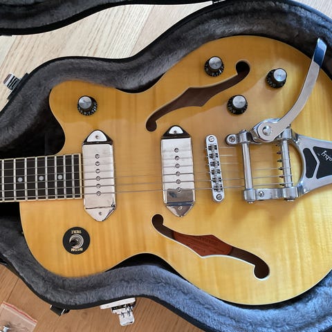 I veldig god stand. Noen ørsmå ubetydelige bruksmerler. Satt opp med lave strenger uten klirrr og med 11-51 slepne strenger. Original hard koffert følger med. Bytte uaktuelt. Kan sende. Mye veldig bra jazzgitar for penga!.