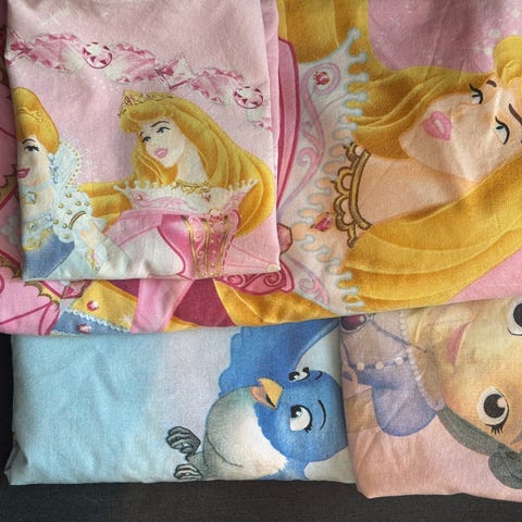 Disney prinsesse sengetøysett i rosa med motiver av kjente prinsesser som Askepott og Snehvit. Laget av myk bomull. Settet inkluderer både dynetrekk og putevar. Passer gjerne best for ungdom/voksen (?) pga mål er 1.90×1.20 (sånn ca). Ikke "som nytt", men et helt greit/fint sengesett. Sendes mot frakt.