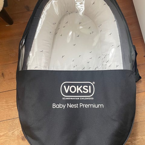 Pent brukt Voksi Baby Nest Premium. Ingen synlige flekker. Det bor en katt i huset, men den har selvfølgelig ikke fått ligge i nestet. Trekket er enkelt å ta av for vask og sette sammen igjen.
