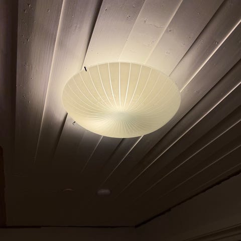 Tre pendel-lamper. Kuppelen er i matt hvitt glass, med svart ledning. Diameter er ca 18cm.