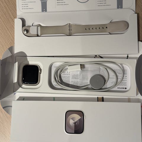 45 mm urkasse av aluminium. Kjøot med flettet Solo Loop i midnatt – størrelse 9. Medfølger også et sort sportsbånd som er kjøpt i ettertid. Original lader følger med.