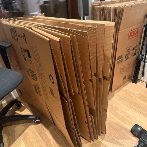 Er ute etter oppevarings bokser og flytteesker i alle slags størrelser, helst levert dersom det lar seg gjøre
