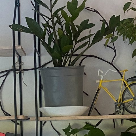 Høyde 55 cm - står i potte 2,5 l. Potteskjuler hvit eller grå strikket av tykt bomullsgarn i spralmønster - høyde 16 cm.