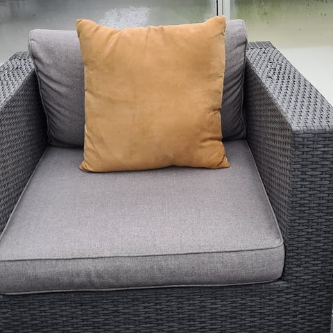Værbestandig lettvektstol i UV-motstandsdyktig kunstrotting. Høy ryggestøtte. Med stolknotter som beskytter stolbenene. Lempet for utendørsbruk.