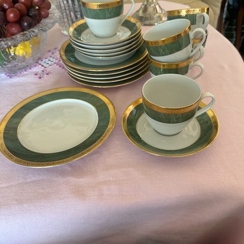 12 kopper, 12 tefat, 12 kakefat, melk/fløtekanne, sukkerskål