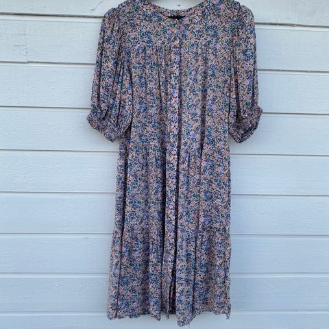 Vakker kjole fra Munthe, meget pent brukt. Ingen hull/skader eller synlig slitasje. Str 38/M, romslig i str, lett i stoffet. 97% viskose. Nydelige sølvtråder, delikat blomstermønster, bunnfargen er skjønn grå-blå. Denne har jeg vært veldig glad i, men den er dessverre blitt for stor til meg. Kjøpt for 2700,-