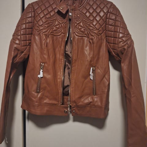 Ukjent merke, andre jakker for dame i størrelse M. Jakken er brun og laget i skinnmateriale. Den har dobbeltradet knappestolpe og en rutete innerfôr i blått, beige og hvitt. Jakken har lommer og detaljer som gir et klassisk utseende.
