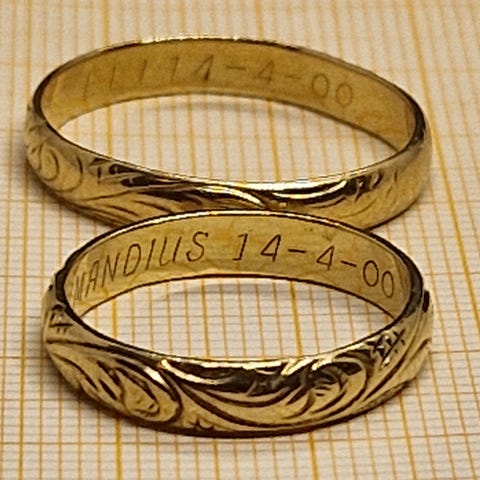 Glatte, klassiske gullringer fra Saint Maurice selges. Ringene er av gul gull, stemplet 585. Innsiden er noe buet for bedre komfort. Ringene er gravert med «Din xxx» på innsiden. Total vekt for paret er 11,6 g.