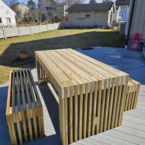 Lager tunge utebenkter som kan stå ute i vær og vind. Benkene er laget slik at du kan sette benkene utav veien og inn under selve bordet.
