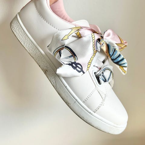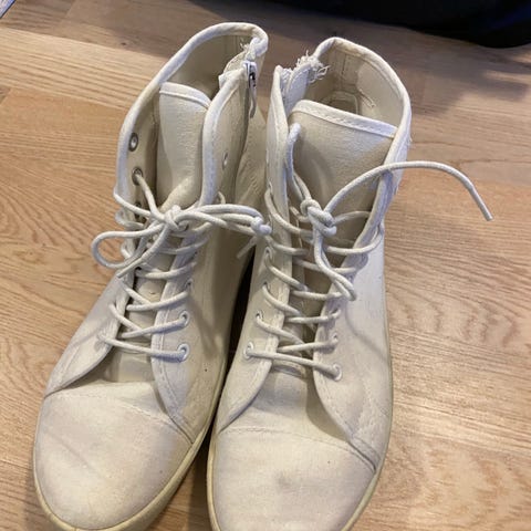 Fine hvite sko med litt hel/platå i stoff. Trenger kanskje en runde i vaskemaskinen, så blir de god som ny