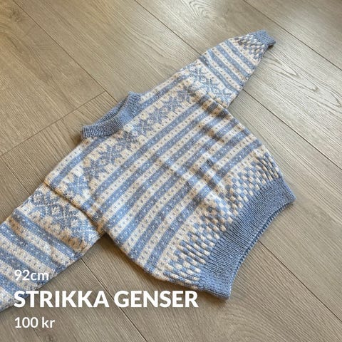 Hjemme strikket Marius genser str 10-12 år. Tynn og god. Den er ikke blitt brukt. Pga at det ble vokst i fra veldig fort
