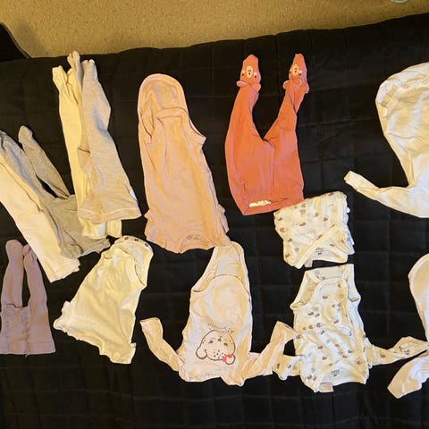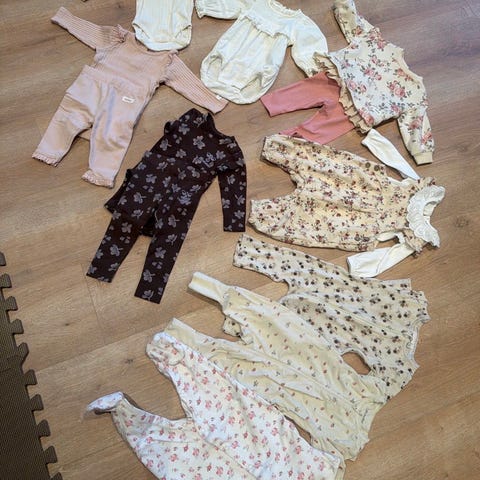 Klespakke til baby. Det meste er pent brukt, men noen svake flekker og slitasje kan forekomme. Selges samlet og billig.