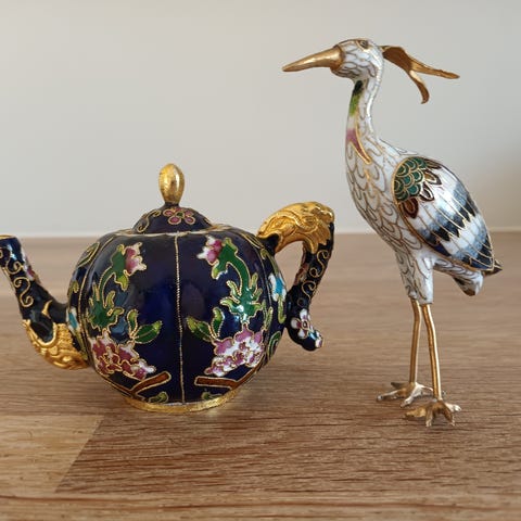 To flotte lysestaker for vegg. Den ene har blå og hvit rund emaljedekor, og med grønn midte.