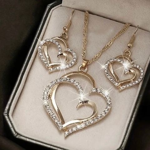 Inneholder matchende halskjede og øredobber i sølvfarget metall, dekorert med glitrende stener i dråpeform.
