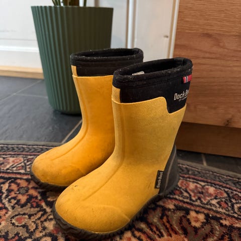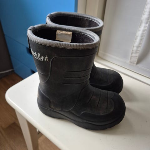 Dock Boot gummistøvler for gutter i størrelse 27. Støvlene er svarte og laget for å tåle våte forhold. De har en solid såle for godt grep og er enkle å ta av og på. Ideelle for regnværsdager og utendørs lek.
