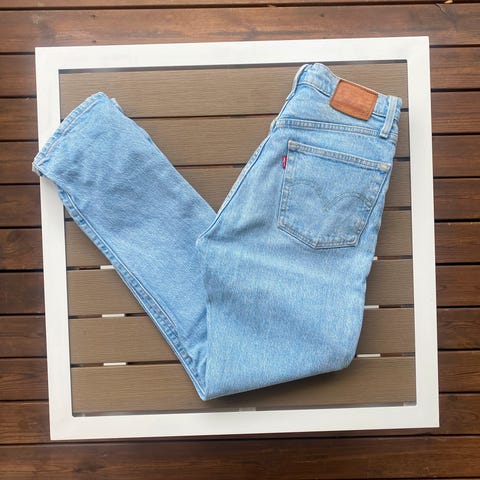 Selges fordi den er for stor til meg, og er derfor brukt kun noen få ganger. Har dessverre klipt av lappen der størrelsen står, men det er en 26x30. Litt stor på størrelsen kanskje. Den kalles two tone og har et lyseblått og et mørkeblått bukseben.
