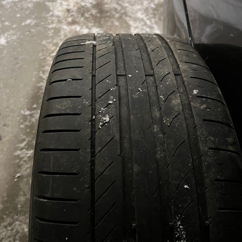 Hvor det ene dekket har en flenge i dekket (kun gummien)