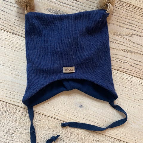 Blå Kivat lue med beige og brune striper.