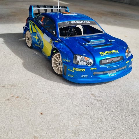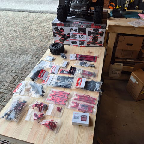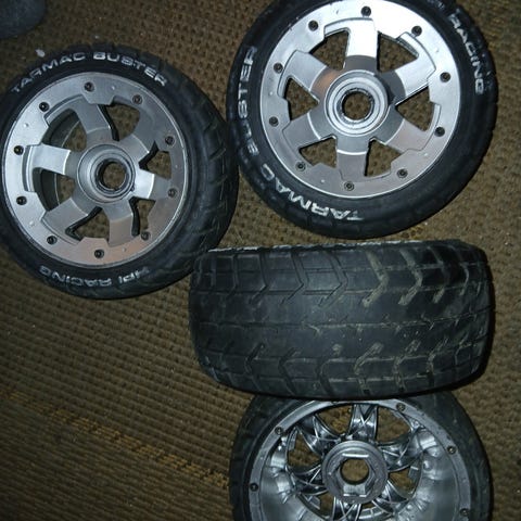 Lader, 2 stk 4S batterier, fjernkontroll, hjulstrammer og en del reservedeler følger med.